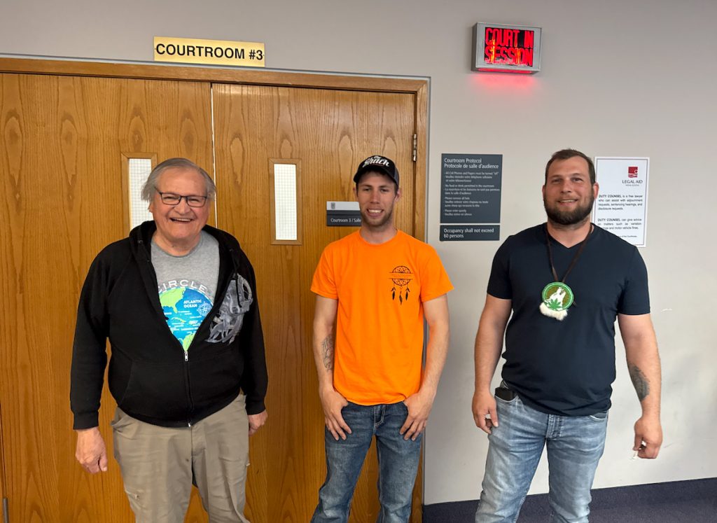 Caption: Former National Chief Delbert Riley with Dustin Whitman and Cody Ward outside of Dartmouth Provincial Courtroom #3 where all cannabis related conditions were dropped after a constitutional challenge.